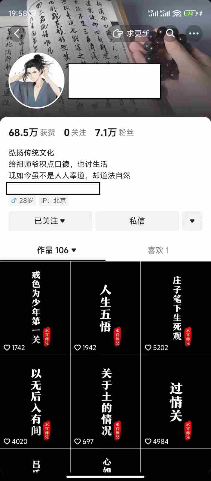 利用AI生成几十字的国学文章,再配上山水画,添加滤镜,关键帧,只需十分钟,一条爆款作品就完成。