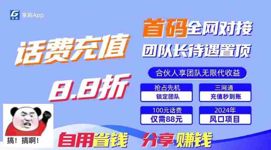 8.8折充值话费,充值立即到账。充值50元话费只需44元,充值100元话费只需88元。可以给自己冲节省开支,也可以让别人代理你获得收益。现在推广即可获得平台和项目教程作者两份高额补贴。6.16号刚刚上线的首码项目,赶快上车
