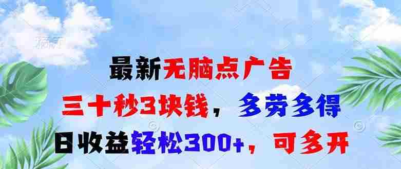 最新无脑点广告,三十秒3块钱,多劳多得,日收益轻松300+,可多开!