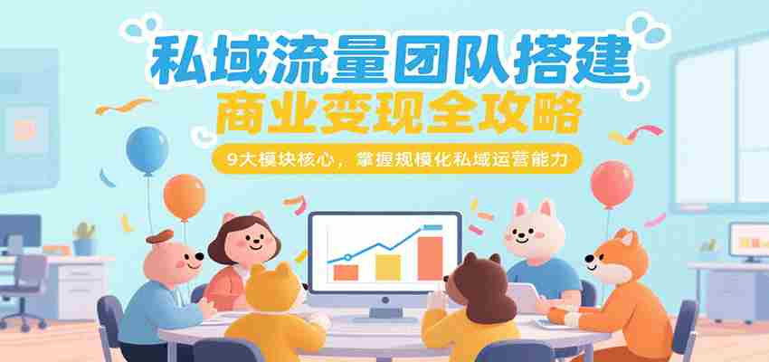 本课程完整覆盖私域流量从团队搭建到商业变现全链路。核心内容包括200人团队运营模型、海陆空私域系统搭建、短视频批量生产、矩阵引流、AD投放、数据资产安全管理、IP塑造、私聊高客单转化及群发售批量转化等9大模块,通过每日专项训练帮助学员掌握规模化私域运营能力。