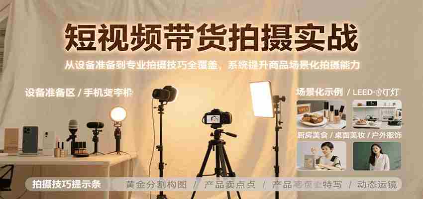 本课程是短视频带货拍摄的实战训练课程,从零基础设备准备到专业拍摄技巧全覆盖。课程包含四大核心模块:灯光场景搭建(三灯布光法、法式/简约风场景搭建)、专业拍摄技巧(构图/视角/机位选择)、Promovie软件实操(参数设置/对焦/白平衡)、后期剪辑调色(音效添加/字幕制作/食品/美妆类调色),通过家居/美妆/食品等实景案例教学,系统提升学员的商品场景化拍摄能力。
