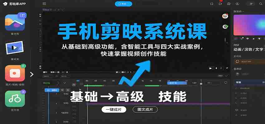 这是一套系统化的手机剪辑教学课程,从软件基础操作到高级功能应用,覆盖素材处理、音画同步、特效添加等全流程剪辑技能,包含一键成片等智能工具使用,并通过四大实战案例(景点/美食/创意/延时)巩固学习成果,帮助用户快速掌握手机视频创作全链路技能。