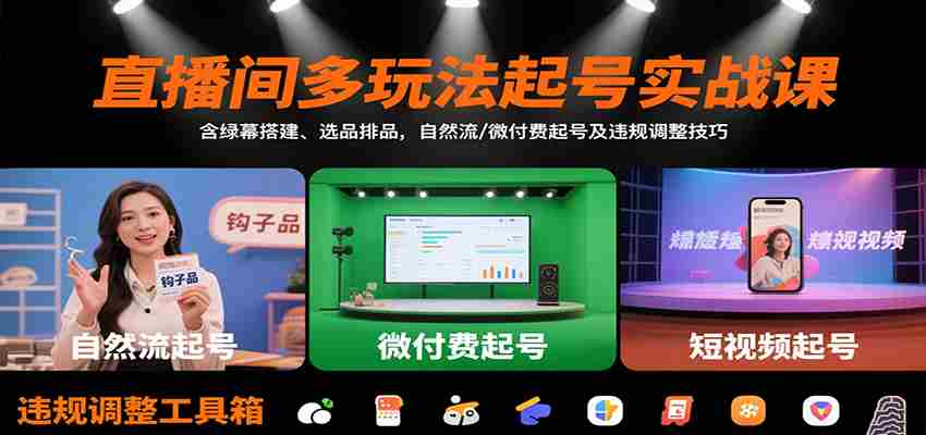 这是一套针对抖音直播带货的实战课程,系统讲解从0到1搭建自然流量直播间的完整方法论。课程包含直播间搭建、选品排品策略、自然流三场起号技术、微付费投放节点控制等核心内容,特别强化"钩子产品+亏品玩法"的流量获取技巧,以及违规后的应急调整方案,帮助新手快速掌握不依赖付费流量的直播带货体系。