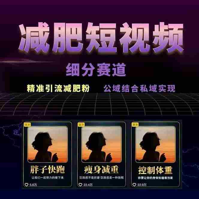 本课程专注减肥短视频赛道运营,涵盖从素材准备(插画/背景视频/音乐)到视频制作(电脑/手机版剪映教学)的全流程,重点讲解精准引流技巧(对标账号分析/爆款素材获取)与变现路径设计(公域转私域策略),提供标准化内容生产模板与违规规避方法。