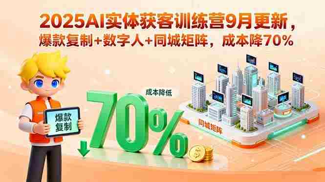 实体商家AI获客新打法【2025年9月】是年度数字化转型课程,涵盖爆款复制、同城矩阵、AI数字人等6大核心模块。通过专属指令集与模板拆解,结合矩阵运营、新风口解析等策略,帮助学员实现获客成本降低70%,转化率提升300%,打造24小时在线的智能商业系统。