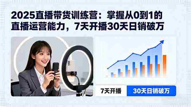 《直播带货流量训练营》是一门系统化的直播实战课程,涵盖账号定位、话术设计、流量获取、数据优化等全链路运营模块。课程通过底层逻辑拆解(如人货场匹配、推流机制)与实战技巧教学(如憋单节奏、塑品话术),帮助学员快速掌握从0到1的直播运营能力,规避违规风险,实现流量精准转化与业绩增长。