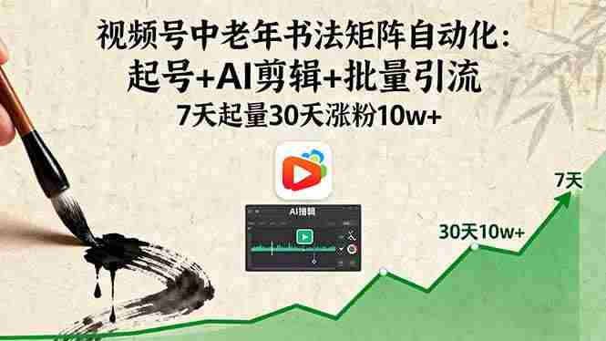 “中老年书法视频号自动化矩阵实战营”=“账号起号+AI批量原创+自动化剪辑”三位一体:10节课教你用AI文案、配音、字幕及3套剪映模板日产1000条书法短视频,100个矩阵号同步上传,7天起量,30天涨粉10万+,后端微信/公众号/小店三端承接,单号月变现3000-8000元,整矩阵月利30万+,可无限复制放大。
